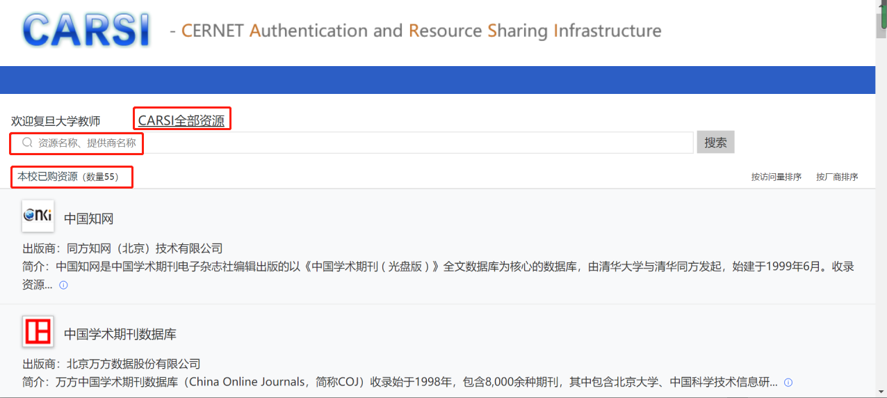 1. 可通过“本校已购资源”、“CARSI全部资源”、搜索框查找所需资源进行访问。