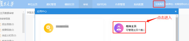 如果您是单位审核员,请点击右上角“切换角色”,点击“教师主页”,进入您的个人主页管理端。