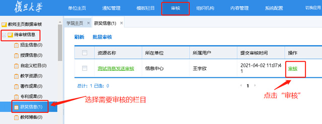 参考《复旦大学网站群管理平台服务条款》,二级单位须确定一名审核人,负责审核本单位的教师个人主页开通申请。单位审核人进入“单位管理端”后,点击“审核”,在左侧“待审核信息”中选定数量>0的栏目内容进行审核。