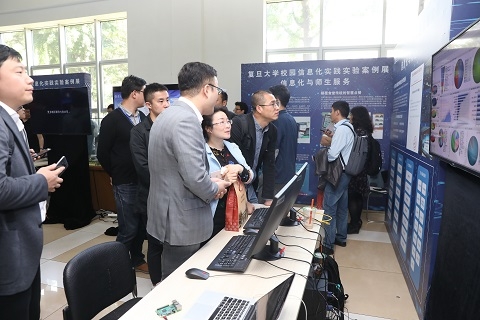 “一网四区十院多出口”的校园城域网、5GHz全覆盖工程、eHall网上办事大厅、智慧校园环境下的自助服务终端、校园物联解决方案、人脸识别解决方案……会场外,“信息化 + 网络建设”“信息化 + 校务管理”“信息化 + 教学科研”“信息化 + 师生服务”“信息化 + 校园生活”“信息化 + 网络安全”和“信息化 + 数据治理”7个智慧校园展览区域让与会者亲身体验复旦师生正在经历及未来将要实现的校园生活。