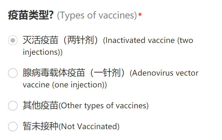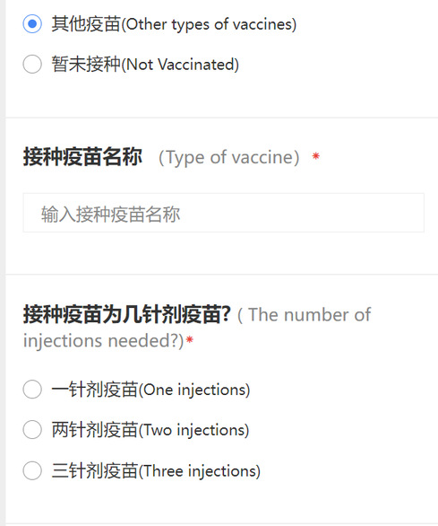 根据实际情况进行“疫苗类型”选择,如果所打疫苗为两针以上疫苗,请选择“其他疫苗”,并填写“接种疫苗名称”。: