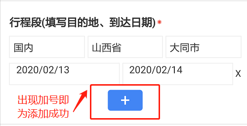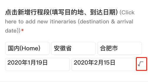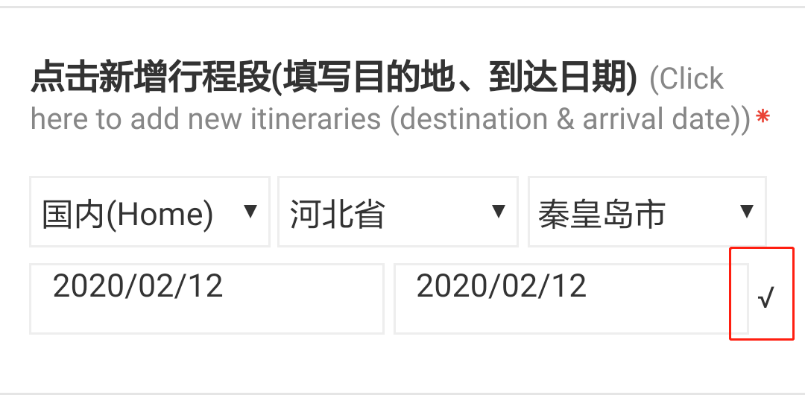 A:在填写“点击新增行程段(填写目的地、到达日期)”时,填写地区及日期后,需勾选“√”按钮后该行程段才会被添加至系统,否则会提示“行程段为空”。如部分手机对特殊符号的显示有问题,点击实际显示的“”即可。添加成功后,会显示如下图所示加号。