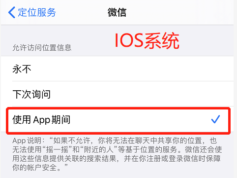 IOS系统设置:设置->隐私->定位服务->微信->允许访问位置信息(使用APP期间)。