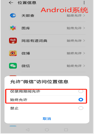 Android系统设置:设置->隐私->定位服务(开启)->位置信息->微信->允许“微信”访问位置信息(仅使用期间允许或始终允许)。