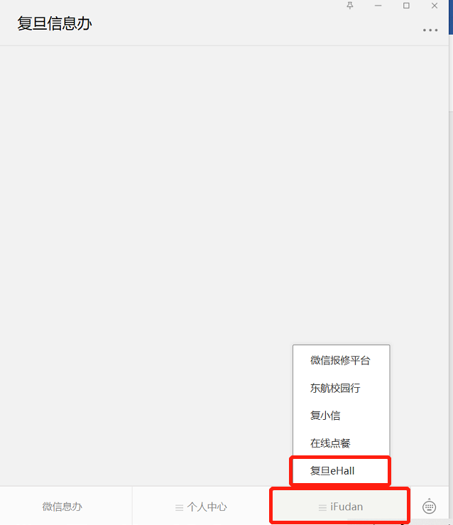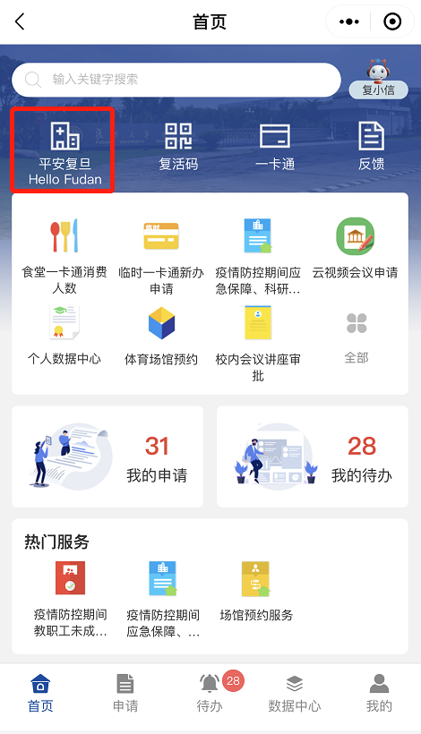 移动端:微信关注“复旦信息办”微信公众号,在菜单“iFudan”中点击“复旦eHall”,或者直接搜索微信小程序“复旦eHall”。通过UIS统一身份认证后登录eHall平台,搜索“平安复旦”服务,点击进入。