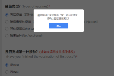 :第一次选择“是否完成第一针接种”时提示一经提交不能修改?