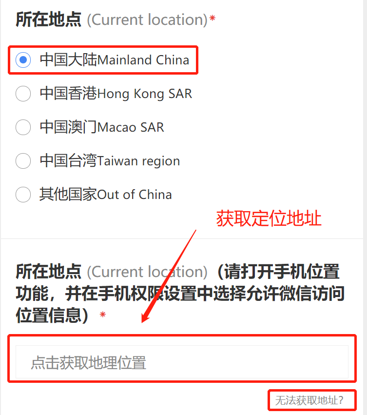 选择“中国大陆”,则点击获取定位地址。如果不能获取定位,请在手机的系统设置中打开定位功能,并允许微信获取位置信息,然后退出微信的进程之后重新打开微信进入。