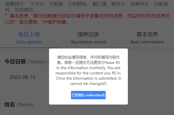 第一次登录时,需首先填写并提交基本信息,然后进入每日上报模块。此后每次登录时,直接进入每日填报模块,请如实填写上报信息,填写完成后点击提交即可。